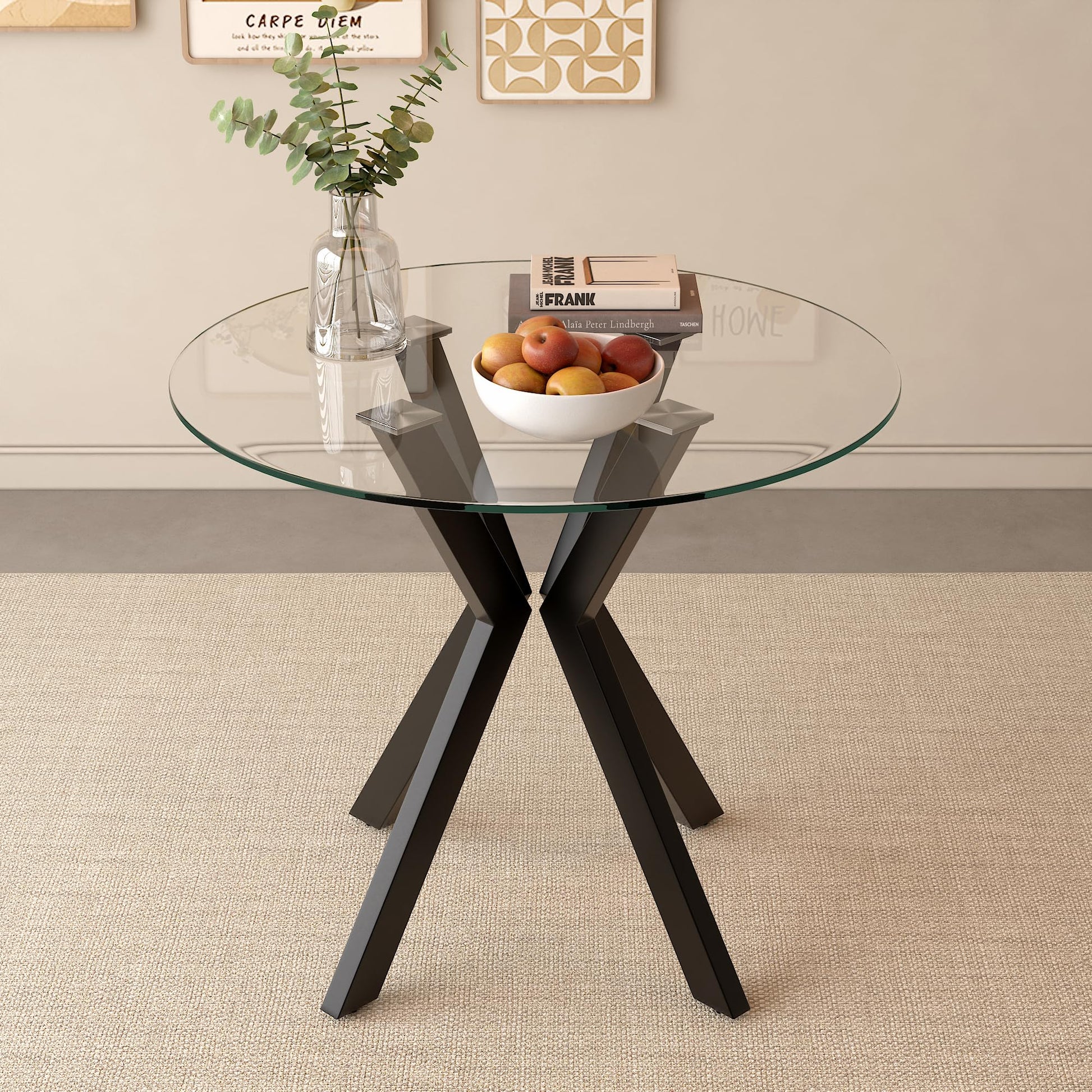 GOLDFAN Round Tempered Glass Dining Table Modern Kitchen Tables with Black Metal Legs 80cm Circle Table for Dining Room Office Lounge