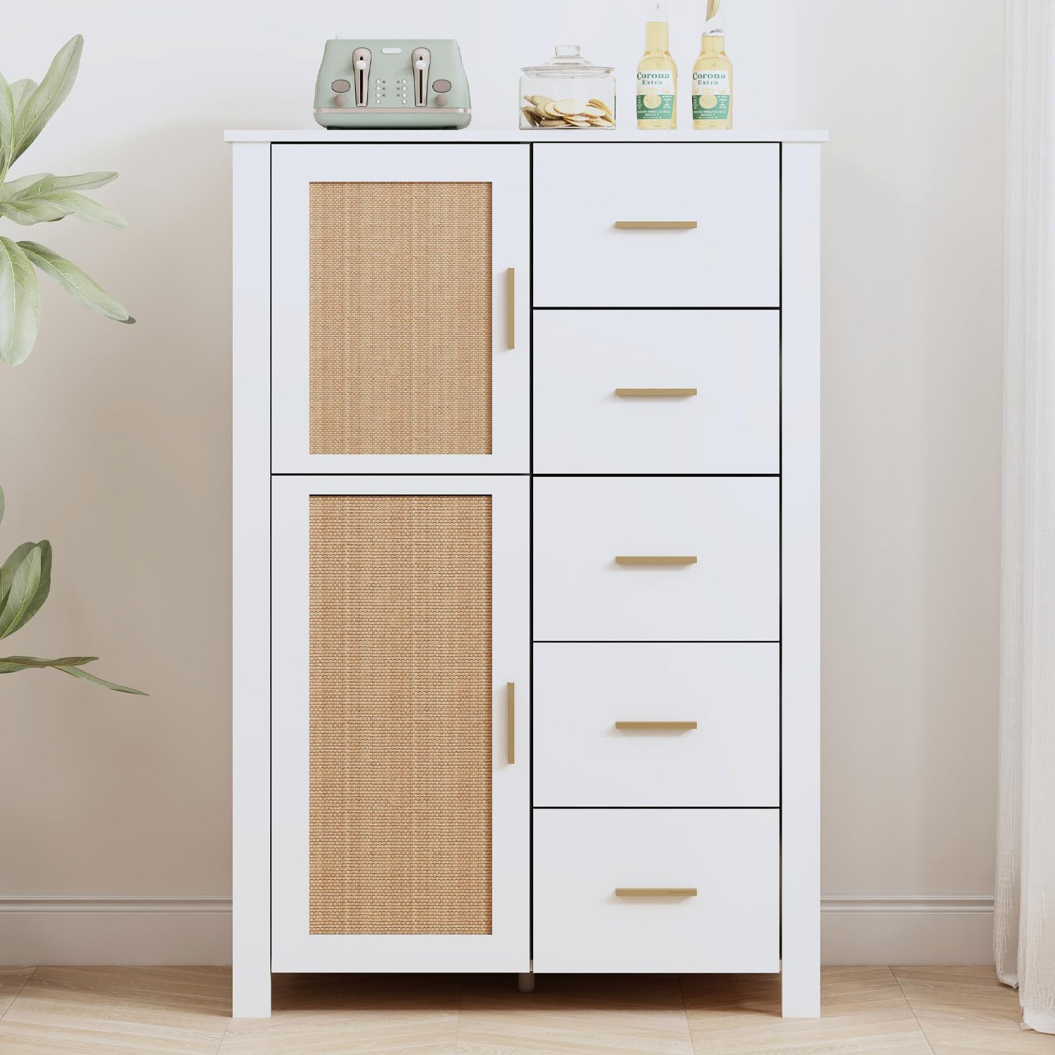 IBF Rattan Chest Of Drawers, Bathroom Floor Cabinet Cupboard With 5 Drawers&2 Doors, 118cm Tall Storage Cabinet, White Oak Wooden Wardrobe With Drawers For Kitchen,Bedroom,Entryway,Living RoomShare