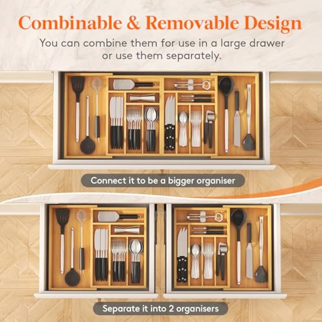 Lifewit Bamboo Extra Large Cutlery Drawer Organiser, Expandable to 36 Inches Cutlery Tray for Kitchen, Adjustable Silverware and Flatware Holder, Plastic Utensil Storage for Spoons Forks Knives