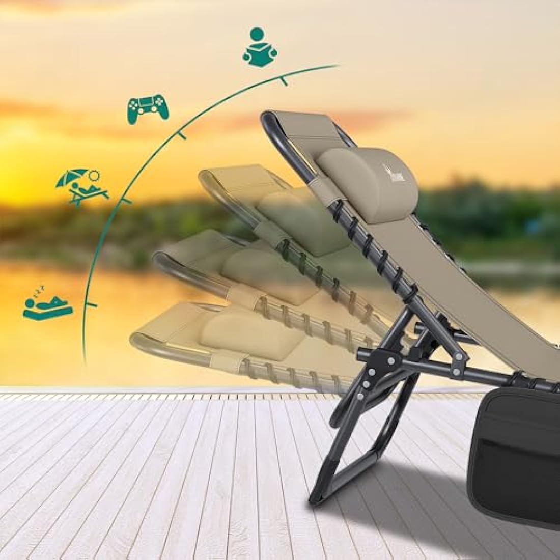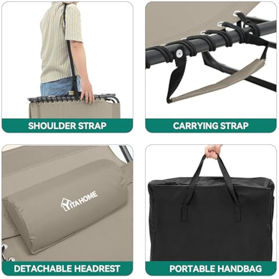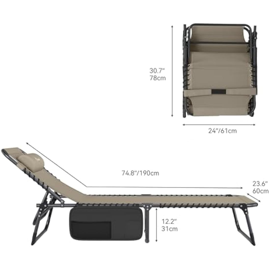 YITAHOME Reclining Sun Lounger Set of 2, Folding Sun Bed 4 Position Adjustable, 190x60x31 cm Sunloungers with Removable Headrest & Side Pocket Load capacity 300lbs for Garden, Beach, Camping, Khaki